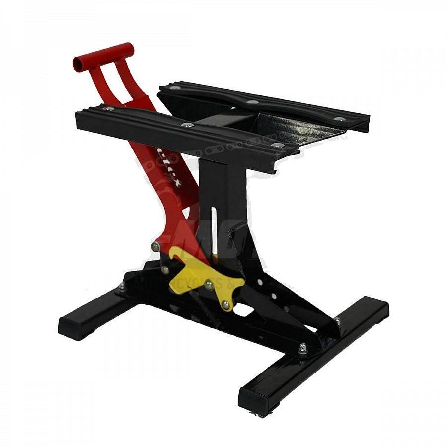 Подставка для мотоциклов METEX. Выдерживает нагрузку до 160 кг и подходит как для питбайков, так и для мотоциклов. Материал сталь. Цвет: черный с элементами красного.